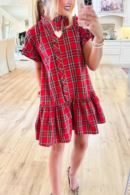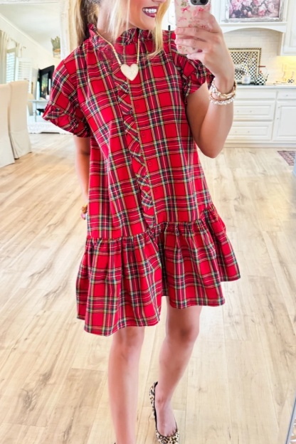 Red Plaid Frilled Neck Mini Dress