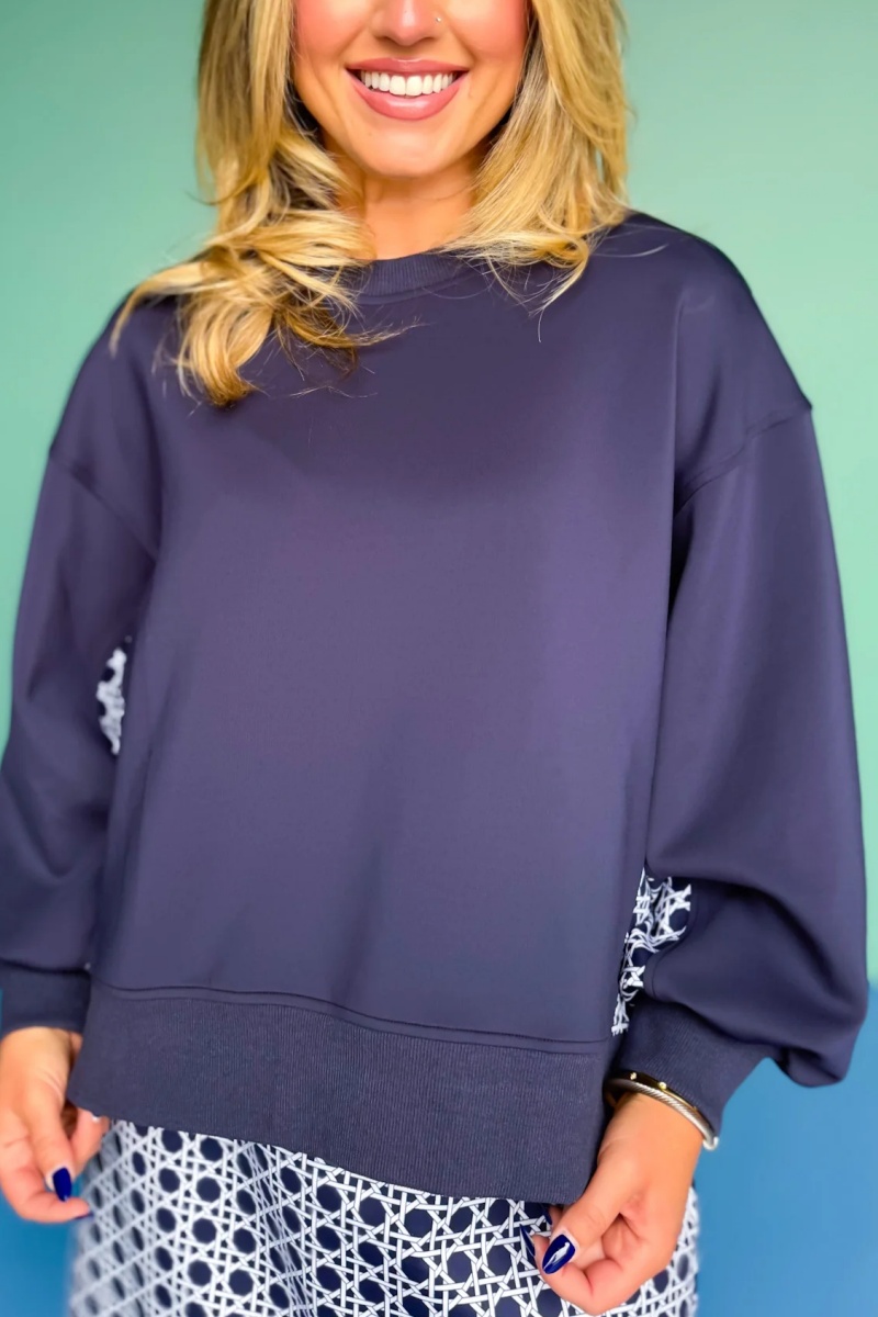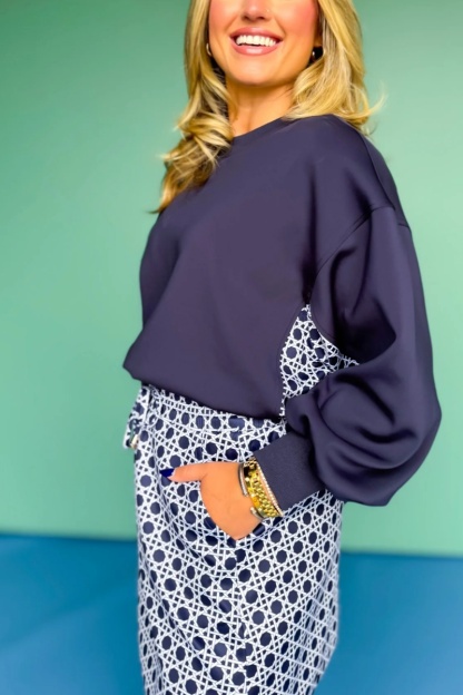 Crew Neck Printed Panel Scuba Set In Navy Cane